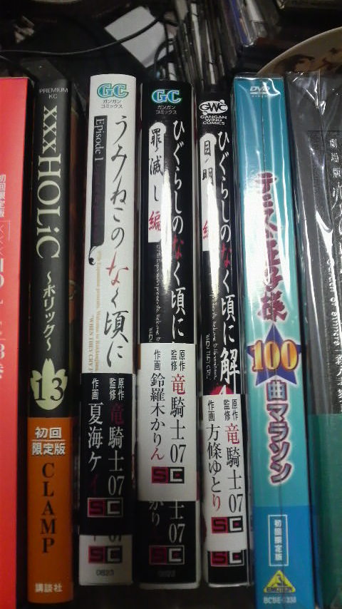 左から順番に『xxxHOLiC(13) 初回限定版』『うみねこのなく頃に(1)』『ひぐらしのなく頃に 罪滅し編(4)』『ひぐらしのなく頃に 目明し編(4)』『テニスの王子様 100曲マラソン』『劇場版 空の境界 第2章 殺人考察(前) 完全限定版』です。「な」が赤いのは仕様ですw