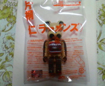 ■BE@RBRICKラーメンズ片桐仁デザインヴァージョンなり。携帯のBE@RBRCKオフィシャルサイトがあるんですが、ココで数ヶ月間プレゼントしていたんですね。毎月応募だったんですが、確か最初の2回くらいしか応募しなかったような。まさか当たるとは思いませんでしたので、届いてビックリ。ちなみに、この写真だと判りにくいかと思いますが…ものすごーくグロいです(笑)。だってねえ…耳に目があるわ、腹は口だわ。